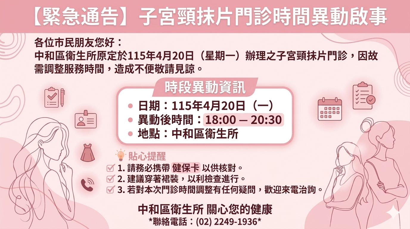 【緊急通告】子宮頸抹片門診時間異動啟事