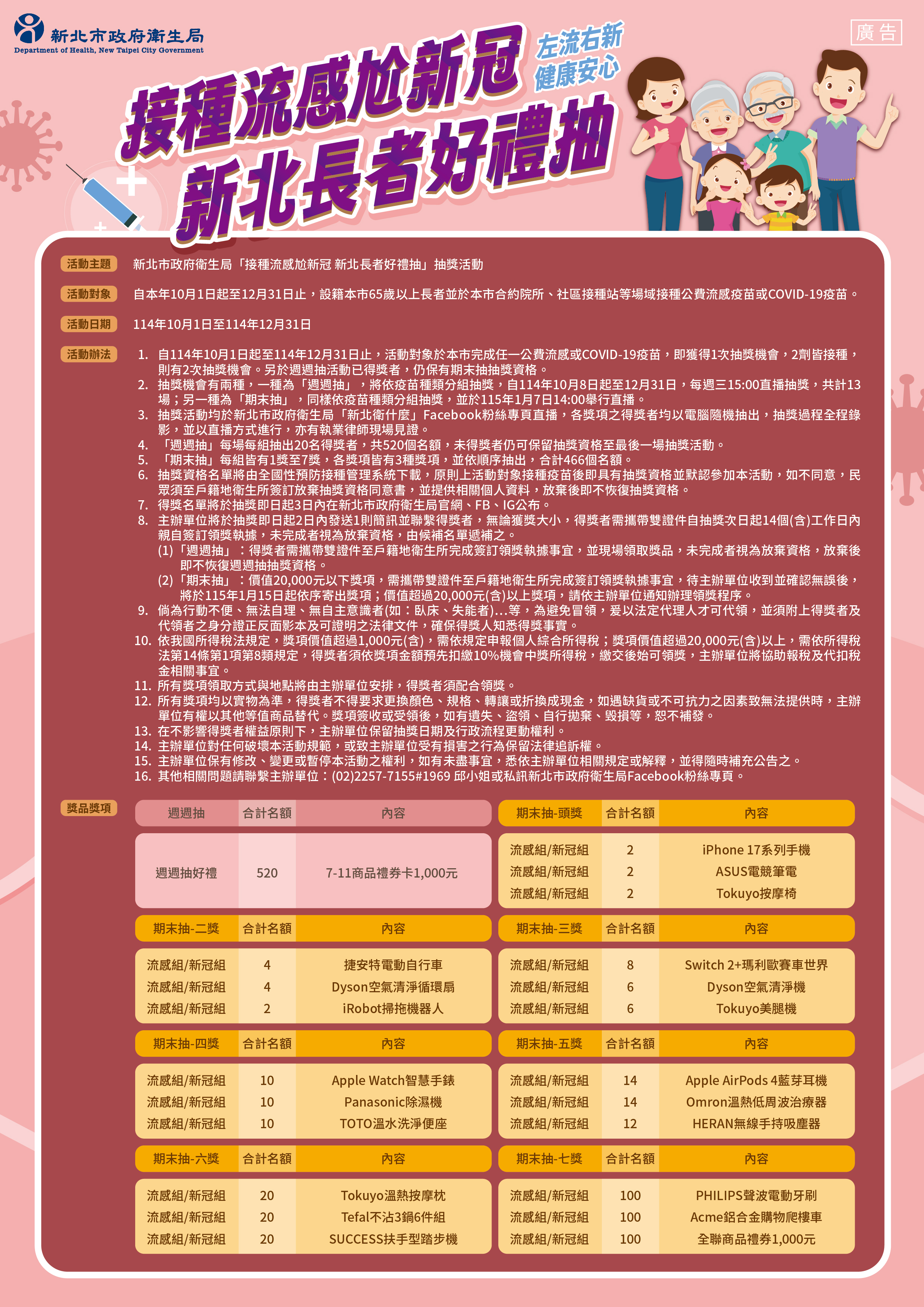 新北市衛生局辦理【接種流感尬新冠 新北長者好禮抽】活動,凡設籍新北市65 歲以上市民自10月1日至12月31日於本市接種流感疫苗或COVID-19 疫苗,即可獲得抽獎資格,獎項名額計986個,最大獎為iPhone 17等多項好禮,價值超過5 萬元!呼籲符合資格民眾儘早接種,除能降低感染風險外,越早接種中獎機會越大。