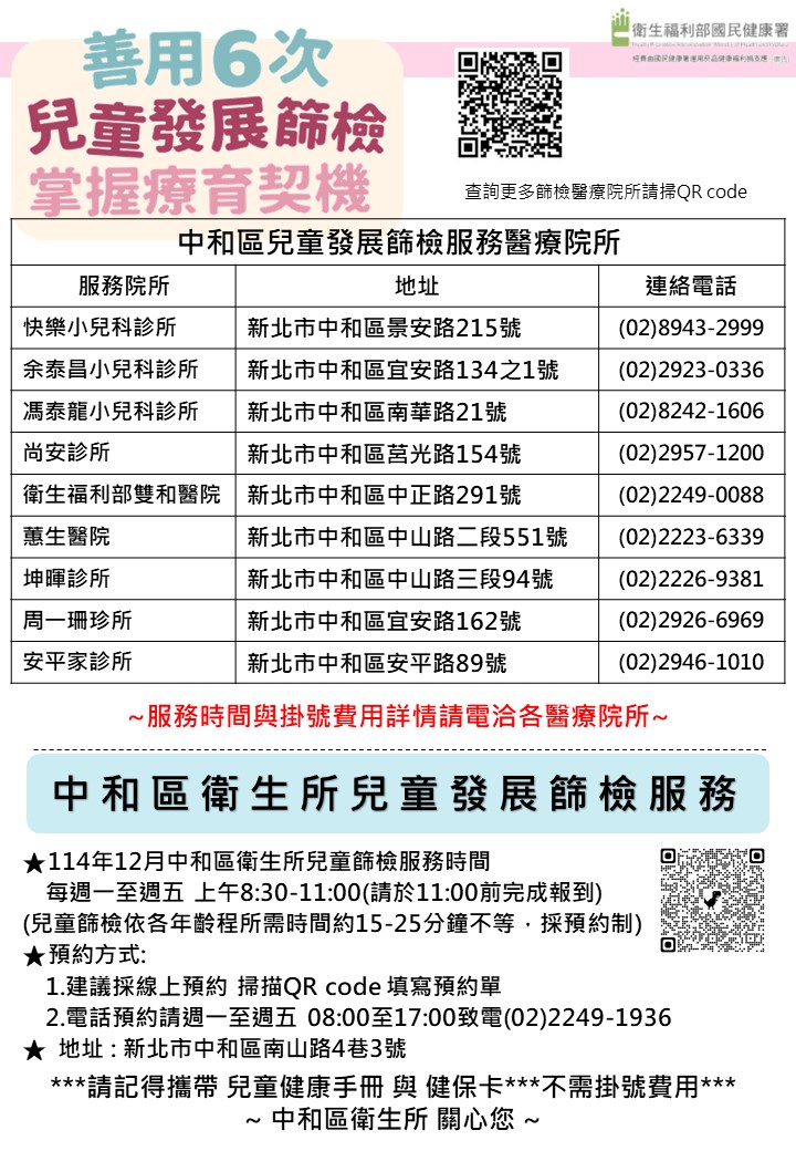 (因應兒童篩檢依各年齡層所需時間約15-25分鐘不等,採預約制)